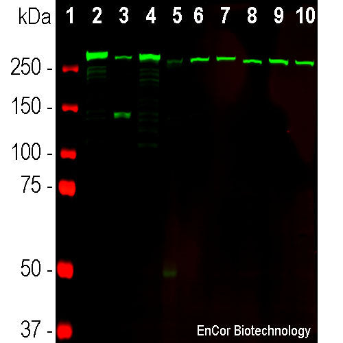 | Immunogen: | Recombinant C-terminal region of human αII spectrin expressed in and purified from E. coli |