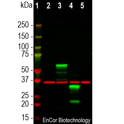 The mCherry protein is engineered from a fluorescent protein originally isolated from a coral and is widely used as a tracer in transfection and transgenic experiments. The prototype for these fluorescent proteins is Green Fluorescent Protein (GFP), which is a ~27kDa protein isolated originally from the jellyfish Aequoria victoria. GFP was the basis of the 2008 Nobel Prize in Chemistry, awarded to Osamu Shimomura, Martin Chalfie and Roger Tsien, specifically “for the discovery and development of the green fluorescent protein, GFP”. The mCherry protein is derived from DsRed, a red fluorescent protein related to GFP isolated from disc corals of the genus Discosoma. DsRed is similar in size and properties to GFP, but, obviously, produces a red rather than a green fluorochrome. The original DsRed was engineered extensively in the Tsien lab to prevent it from forming tetramers and dimers and to modify and improve the spectral properties (1-3). Several further cycles of mutation, directed modification and evolutionary selection produced mCherry, which has an excitation maximum at 587nm and and emission maximum at 610nm (4). The same lab engineered other fluorescent DsRed derivatives such as tdTomato, mOrange, mStrawberry and others. This antibody likely binds all these variants and is known to bind tdTomato.