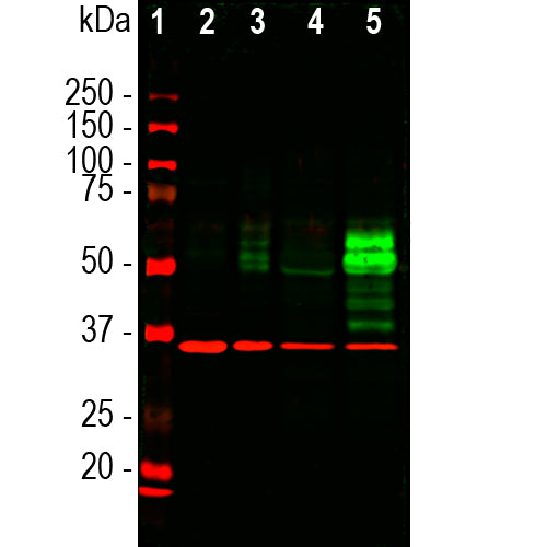 Western blot analysis of cell lysates using mouse mAb to cFos, MCA-2H2, dilution 1:1,000, in green, and rabbit pAb to GAPDH, RPCA-GAPDH, dilution 1:20,000, in red, used as a loading control.  [1] protein standard (red), [2] HeLa cells cultured in FBS free media. [3] HeLa cells stimulated with 20% FBS for 2hours after having been cultured in serum free media for 36 hours . [4] rat cortical neurons. [5] rat cortical neurons treated with membrane depolarization buffer for 5hours.  Multiple bands at 50-65kDa in stimulated or treated cell lysates correspond to different forms of the c-Fos protein. The single band at 37 kDa represents GAPDH protein.