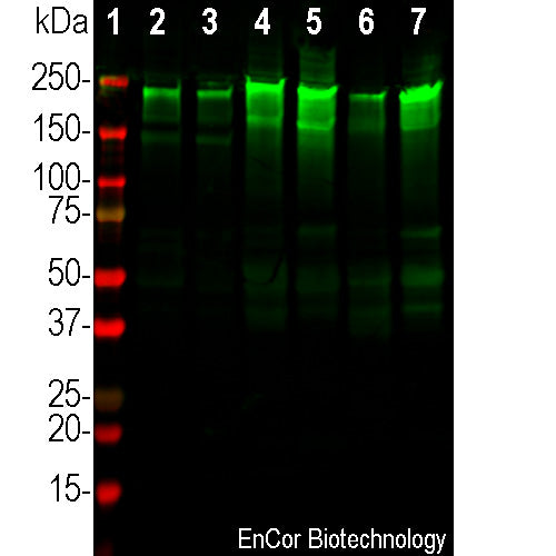 Neurofilaments are the 10nm or intermediate filament proteins found specifically in neurons, and are composed predominantly of three major proteins called NF-L, NF-M and NF-H, though other proteins may also be present. NF-H is the neurofilament high or heavy molecular weight polypeptide and runs on SDS-PAGE gels at 200-220 kDa, with some variability across species boundaries. The protein is in reality much smaller in molecular size, about 110kDa (1,2). The unusual SDS-PAGE mobility is due partly to a very high content of charged amino acids, particularly glutamic acid rich regions, and the non-phosphorylated form runs on SDS-PAGE at about 160kDa. The predominant type of NF-H is the axonal form which is heavily serine phosphorylated on 40 or more tandemly repeated lysine-serine-proline (KSP) containing peptides (3-5). The phosphorylation of these peptides results in considerable further retardation on SDS-PAGE gels, so the heavily phosphorylated axonal form runs at 200-220kDa with some species variability. Antibodies to NF-H are useful for identifying axonal processes in tissue sections and in culture. NF-H antibodies can also be useful in visualizing neurofilament accumulations seen in many neurological disorders, such as Amyotrophic Lateral Sclerosis (also known as Lou Gehrig’s disease), Alzheimer’s disease and following traumatic injury. The phosphorylated axonal form of NF-H usually referred to as pNF-H, can be detected in blood and CSF following a variety of damage and disease states resulting in axonal compromise, and antibodies such as this can be used to used to quantify such ongoing axonal loss (e.g. 6-8).