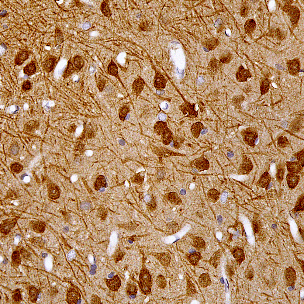 Chromogenic immunostaining of a 4% PFA fixed paraffin embedded rat brain cortex section with mouse mAb to UCHL1, MCA-BH7, dilution 1:10,000, detected with DAB (brown) using the the Vector Labs ImmPRESS method and reagents with citrate buffer retrieval. Hematoxylin (blue) was used as the counterstain. UCHL1 is extremely abundant in the cell bodies and dendrites in a majority of neuronal cells. This antibody performs well in testing with both 4% PFA and standard NBF fixed human, mouse and rat tissues. Mouse select image for larger view.