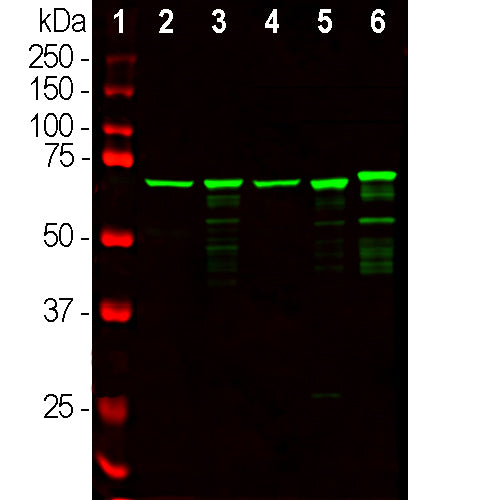 Western blot analysis of tissue lysates probed with chicken pAb to NF-L, CPCA-NF-L, dilution 1:20,000 in green: [1] protein standard (red), [2] rat brain, [3] rat spinal cord, [4] mouse brain, [5] mouse spinal cord and [6] cow spinal cord. Strong bands at ~68kDa corresponds to NF-L proteins which are known to have slightly different apparent SDS-PAGE molecular weights across species boundaries.