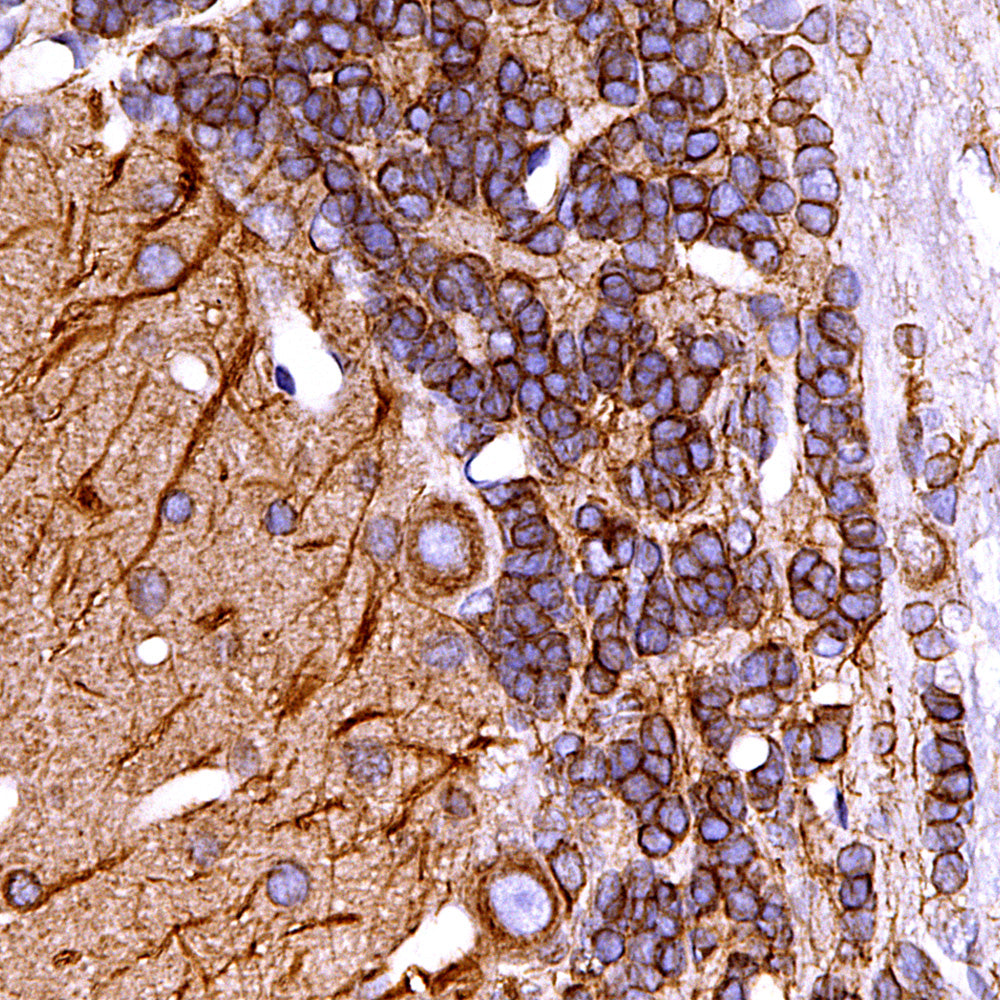 Chromogenic immunostaining of a 4% PFA fixed paraffin embedded rat cerebral cortex section with mouse mAb to β-tubulin, MCA-4E4, dilution 1:1,000, detected with DAB (brown) using the Vector Elite ABC-HRP detection and reagents with citrate buffer retrieval. Hematoxylin (blue) was used as the counterstain. MCA-4E4 antibody labels the cytoplasm of neurons (pyramidal cells in this image) and endothelial cells as well as the neuropil. This antibody performs well in testing with both 4% PFA and standard NBF fixed tissues. Mouse select image for larger view.