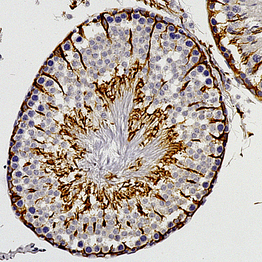 Chromogenic immunostaining of a 4% PFA fixed paraffin embedded rat testes section with mouse mAb to doublecortin, MCA-3E1, dilution 1:1,000, detected with DAB (brown) using the Vector Labs ImmPRESS method and reagents with citrate buffer retrieval. Hematoxylin (blue) was used as the counterstain. MCA-3E1 labels the Sertoli cells, the basement membrane and the late-stage spermatocytes. This antibody has not been tested in NBF fixed material. Mouse select image for larger view.