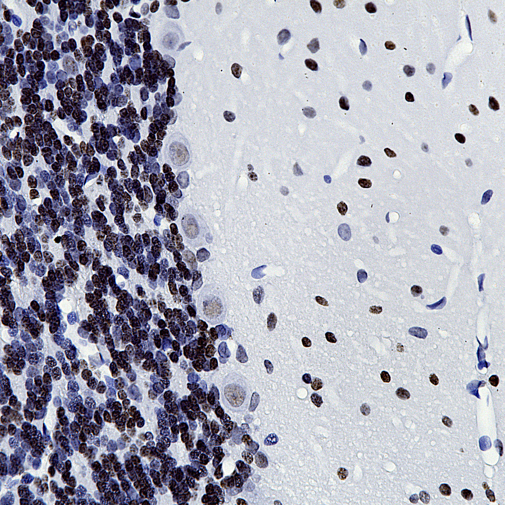 Chromogenic immunostaining of a 4% PFA fixed paraffin embedded rat hippocampus section with mouse mAb to MeCP2, MCA-4F11, dilution 1:1,000, detected with DAB (brown) using the Vector Elite ABC-HRP detection and reagents with citrate buffer retrieval. Hematoxylin (blue) was used as the counterstain. MCA-4F11 labels the nuclei of neurons with varying degree of expression. This antibody performs well in testing with 4% PFA fixed tissues but does not stain NBF fixed tissue effectively. Mouse select image for larger view.