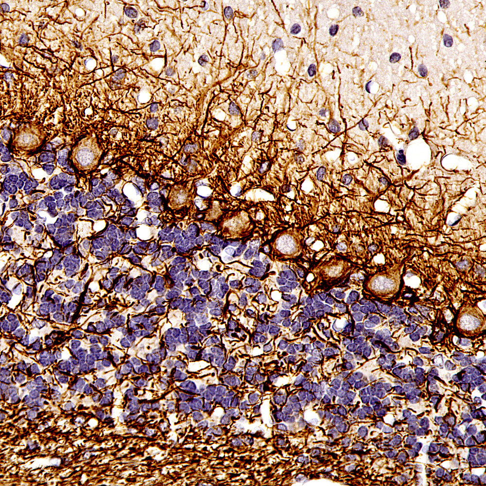 Chromogenic immunostaining of a formalin fixed paraffin embedded human cerebellum section with mouse mAb to NF-L, MCA-6H112, dilution 1:4,000, detected with DAB (brown) using the the Vector Labs ImmPRESS method and reagents with citrate buffer retrieval. Hematoxylin (blue) was used as the counterstain. MCA-6H112 labels neuronal cells and their processes. This antibody performs well in testing with both 4% PFA and standard NBF fixed tissues and is our recommended clone for use in NF-L immunostaining of human tissue. Mouse select image for larger view.